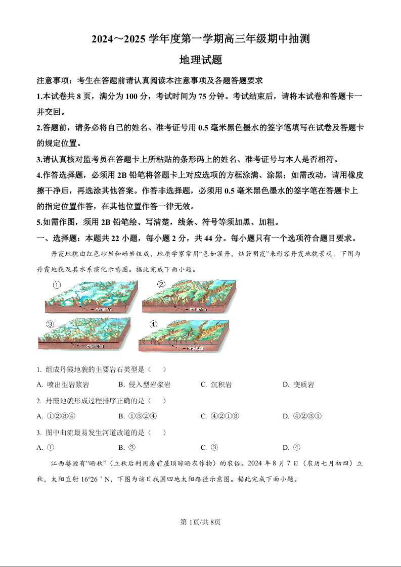 江苏省徐州市2025届高三上学期11月期中考试 地理