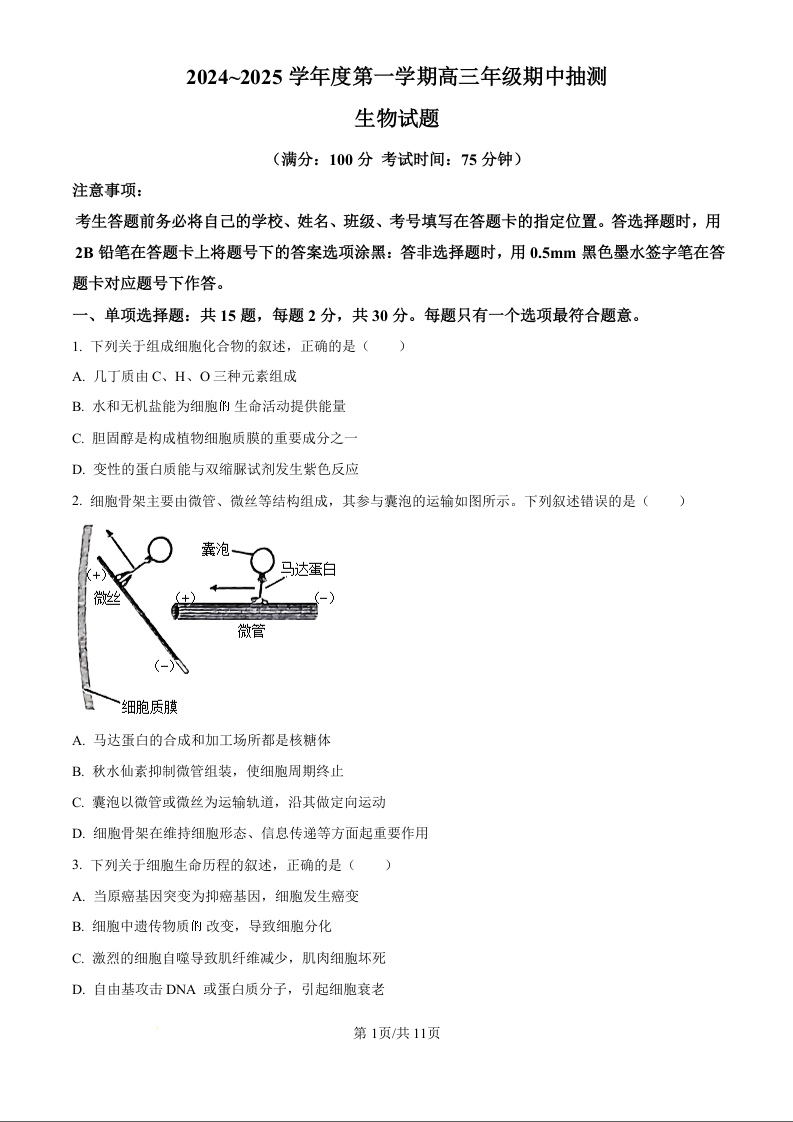 江苏省徐州市2025届高三上学期11月期中考试 生物