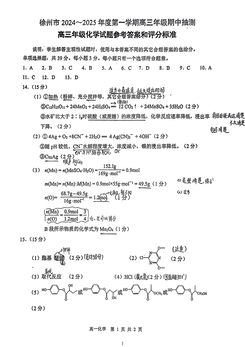 江苏省徐州市2025届高三上学期11月期中考试 化学答案