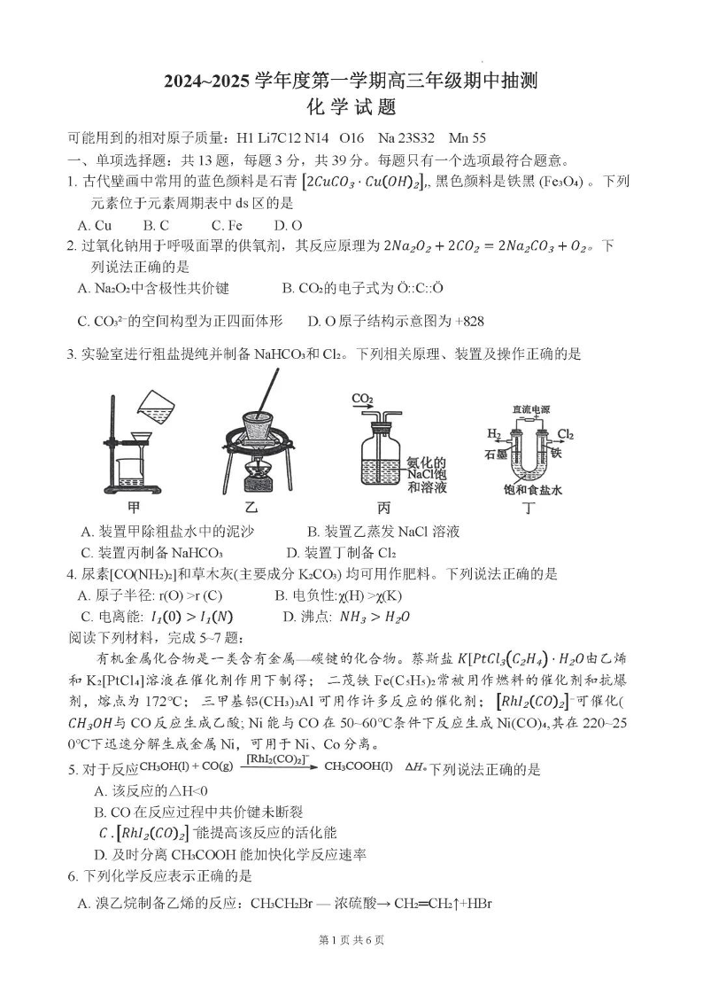 江苏省徐州市2025届高三上学期11月期中考试 化学