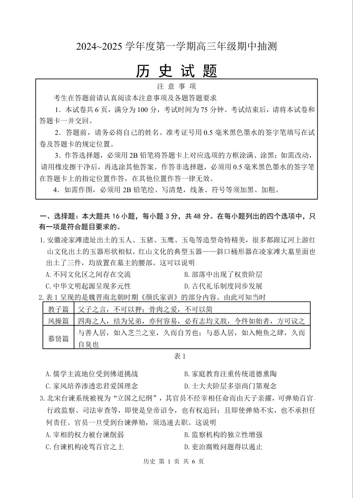 江苏省徐州市2025届高三上学期11月期中考试 历史