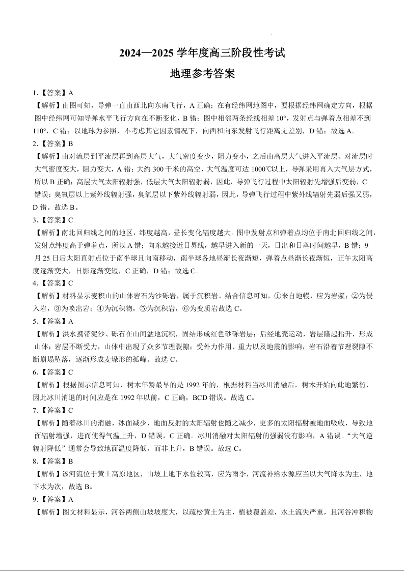 河南省三门峡市2024-2025学年度高三阶段性考试 地理答案