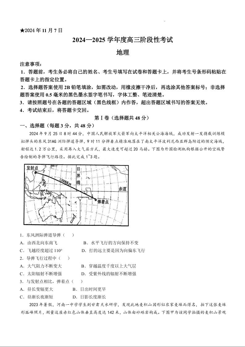 河南省三门峡市2024-2025学年度高三阶段性考试 地理