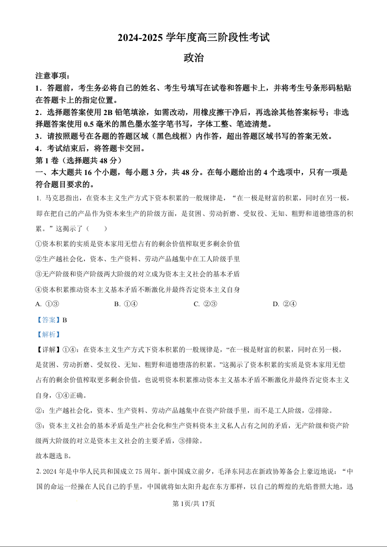 河南省三门峡市2024-2025学年度高三阶段性考试 政治答案