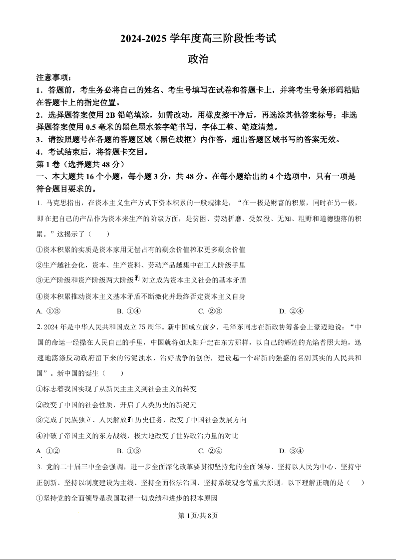 河南省三门峡市2024-2025学年度高三阶段性考试 政治