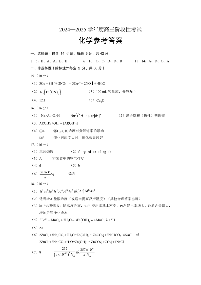 河南省三门峡市2024-2025学年度高三阶段性考试 化学答案