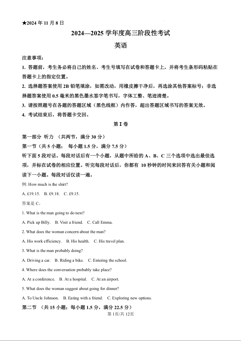 河南省三门峡市2024-2025学年度高三阶段性考试 英语