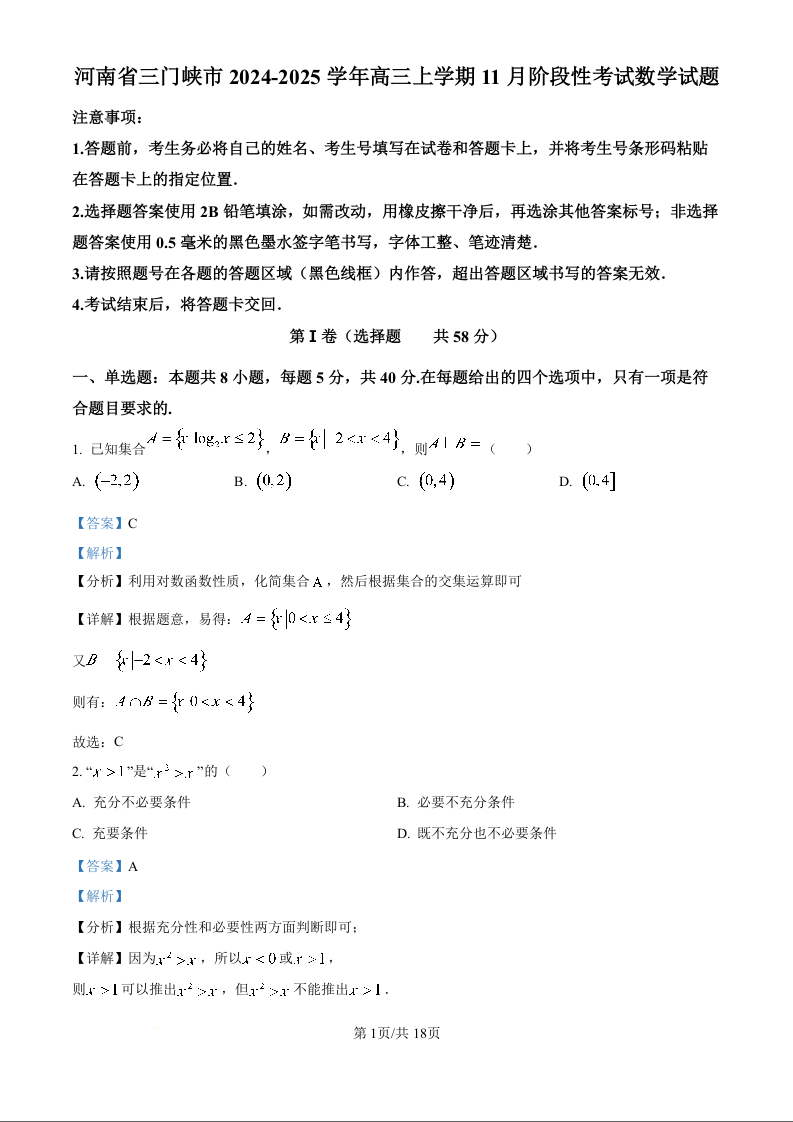 河南省三门峡市2024-2025学年度高三阶段性考试 数学答案