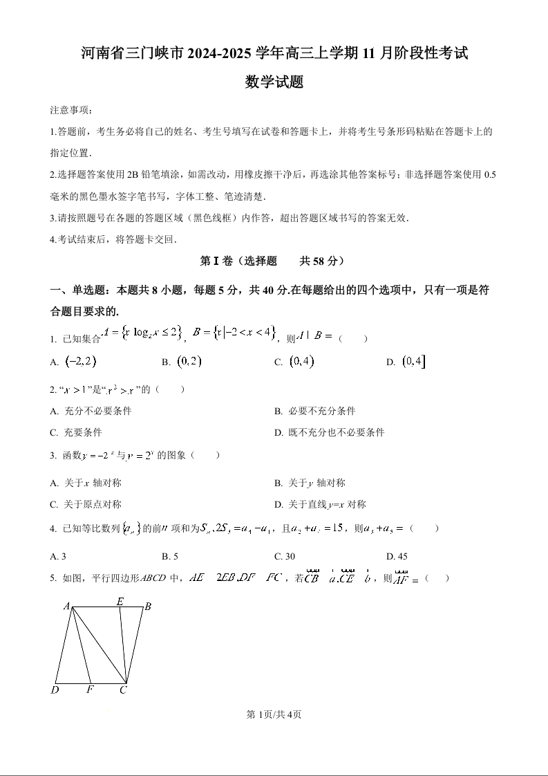 河南省三门峡市2024-2025学年度高三阶段性考试 数学