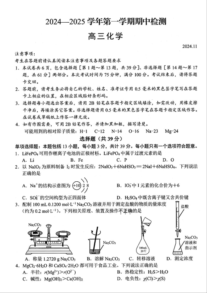 江苏省扬州市2025届高三上学期11月期中考试 化学