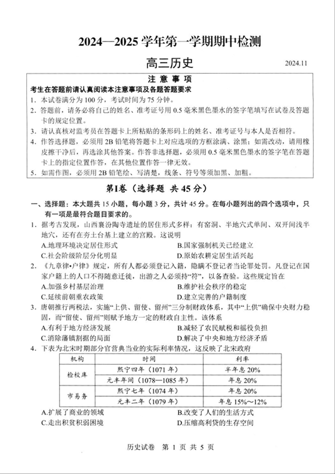 江苏省扬州市2025届高三上学期11月期中考试 历史