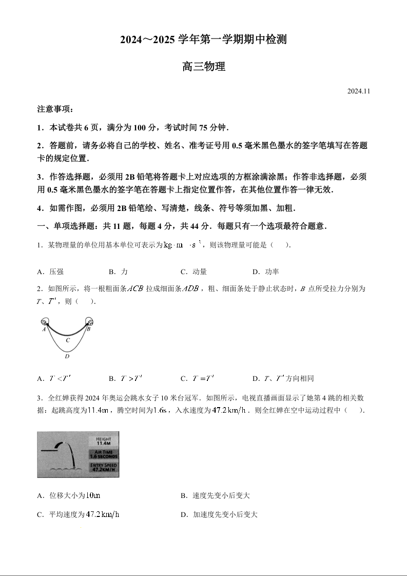 江苏省扬州市2025届高三上学期11月期中考试 物理