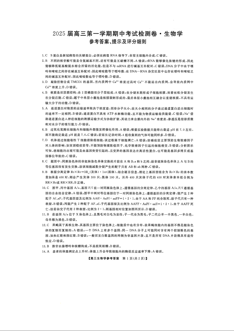 陕西省十七校2024-2025学年高三上学期11月期中联考 生物答案