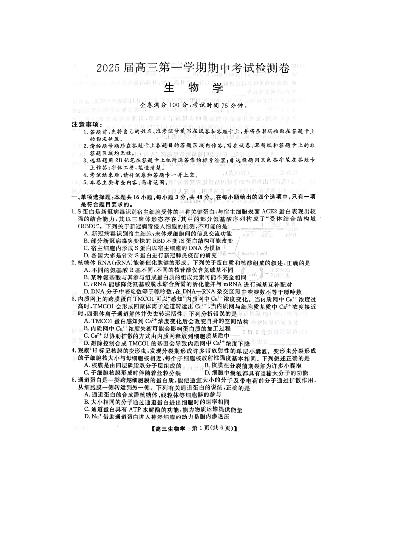 陕西省十七校2024-2025学年高三上学期11月期中联考 生物