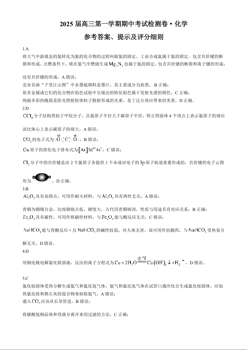 陕西省十七校2024-2025学年高三上学期11月期中联考 化学答案