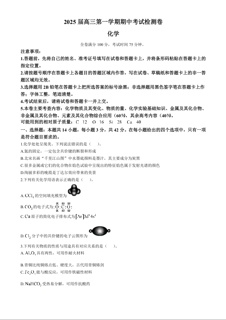 陕西省十七校2024-2025学年高三上学期11月期中联考 化学