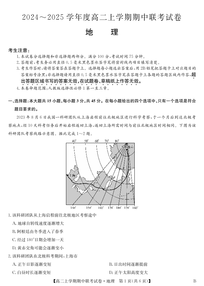 河南商师联盟2024-2025学年高二上学期期中联考 地理
