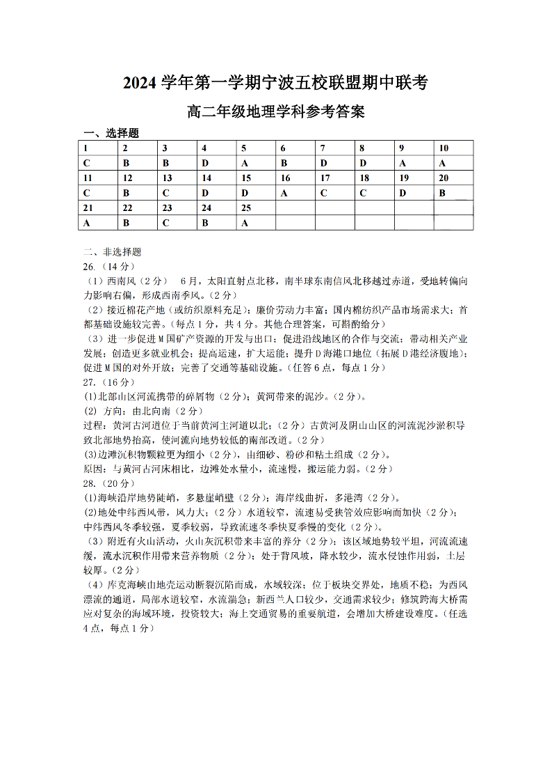宁波五校联盟2024学年高二第一学期期中联考 地理答案