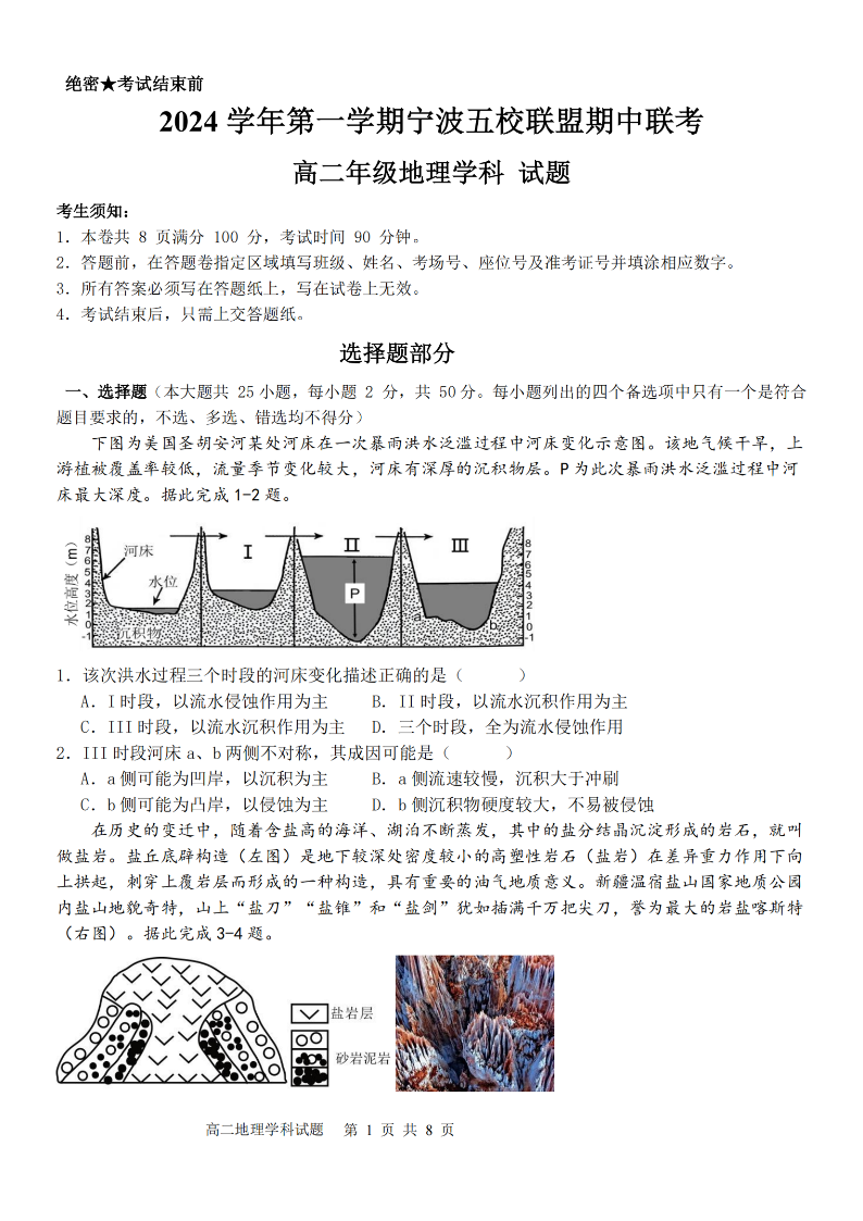 宁波五校联盟2024学年高二第一学期期中联考 地理