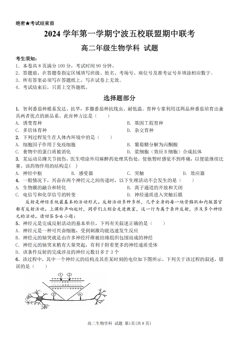 宁波五校联盟2024学年高二第一学期期中联考 生物