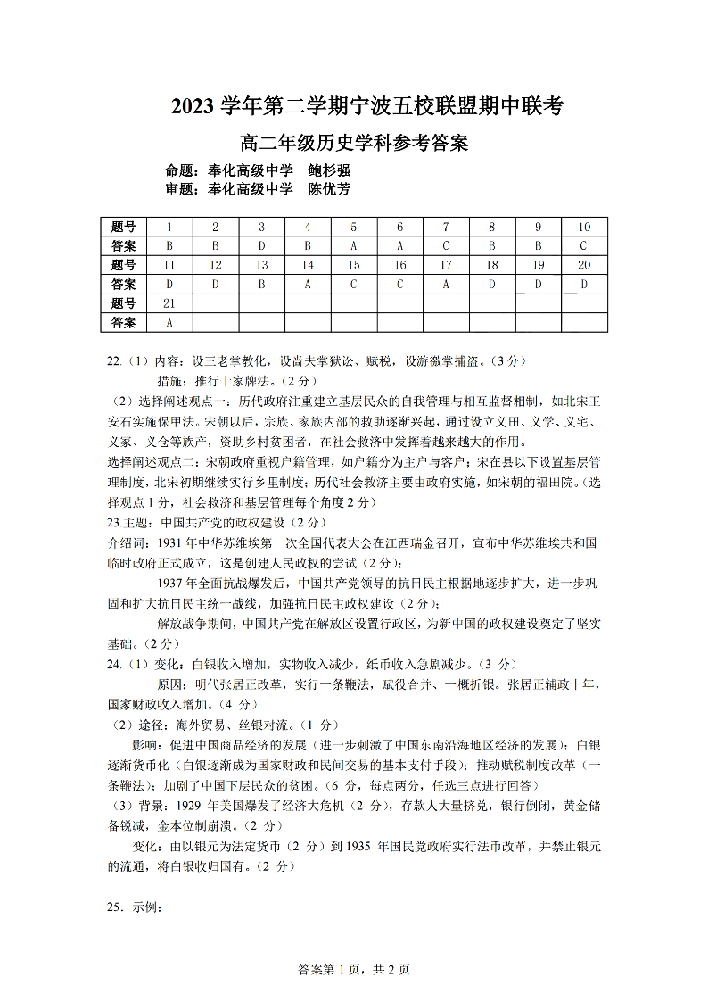 宁波五校联盟2024学年高二第一学期期中联考 历史答案