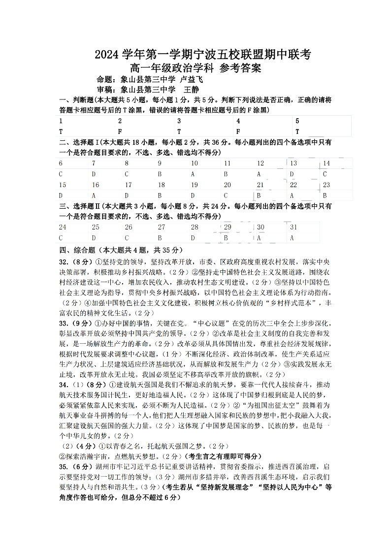 宁波五校联盟2024学年高一第一学期期中联考 政治答案