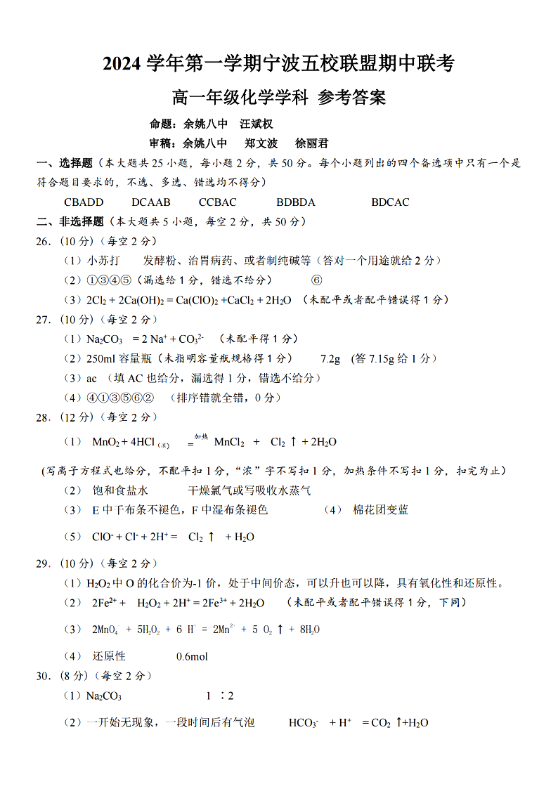 宁波五校联盟2024学年高一第一学期期中联考 化学答案