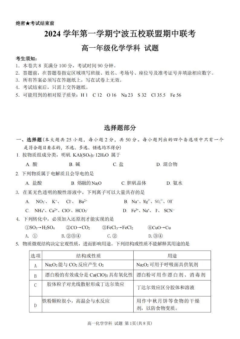 宁波五校联盟2024学年高一第一学期期中联考 化学