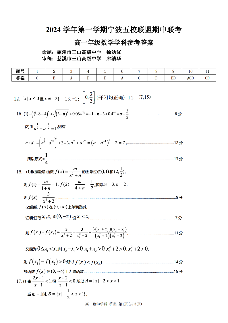 宁波五校联盟2024学年高一第一学期期中联考 数学答案