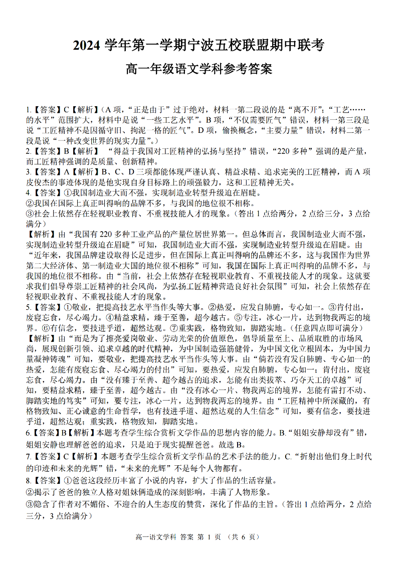 宁波五校联盟2024学年高一第一学期期中联考 语文答案