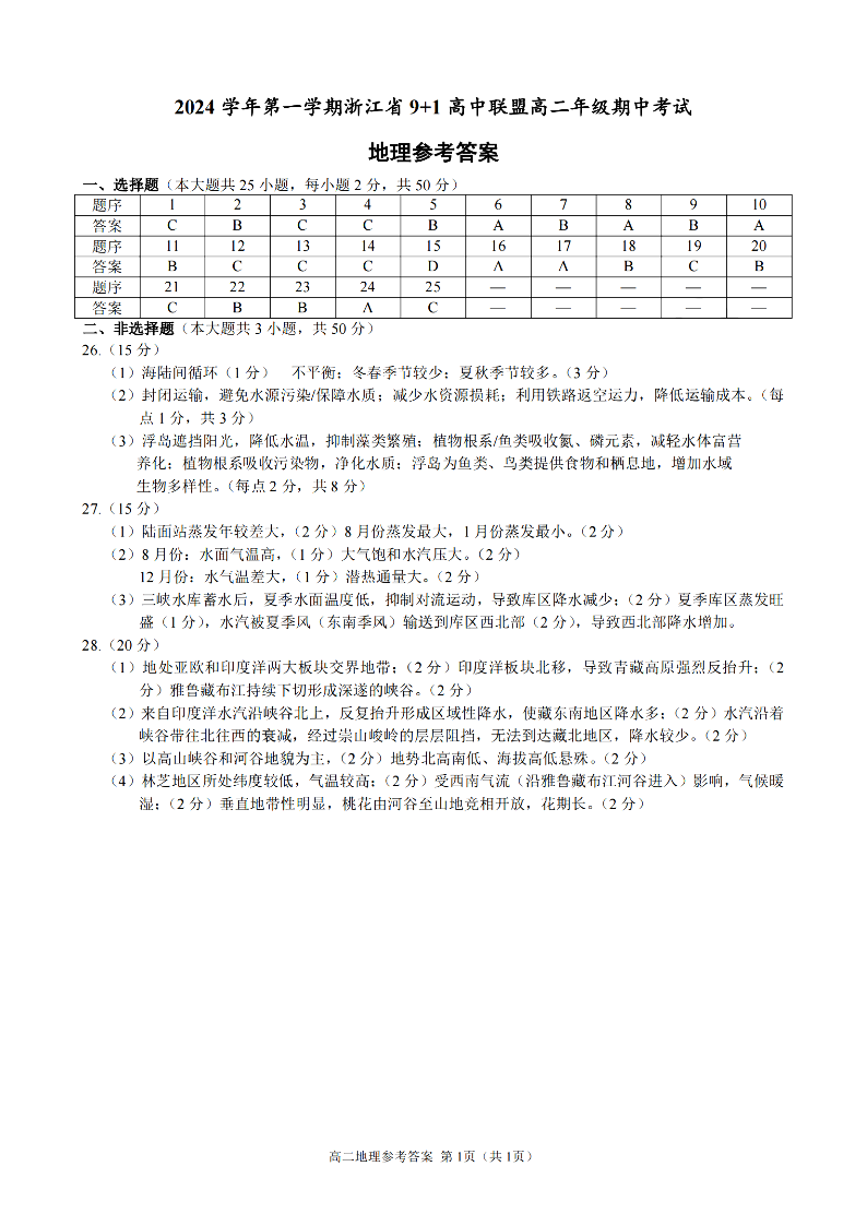 浙江省9+1联盟2024学年高二第一学期期中联考 地理答案