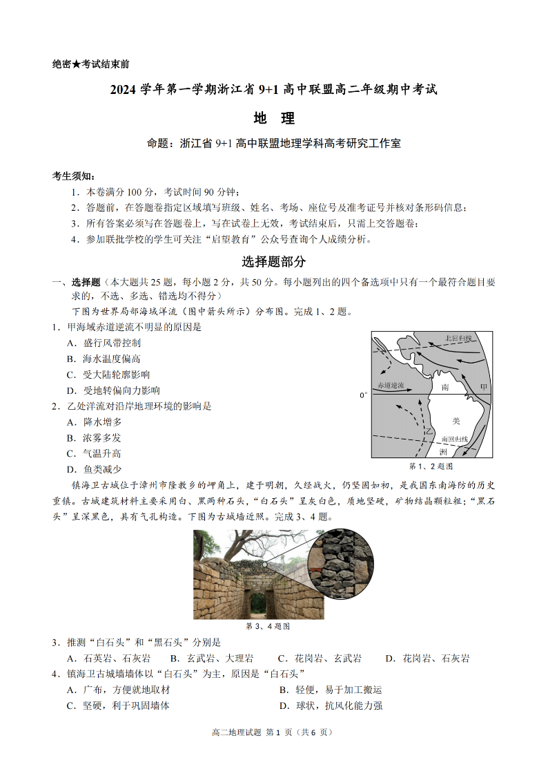 浙江省9+1联盟2024学年高二第一学期期中联考 地理