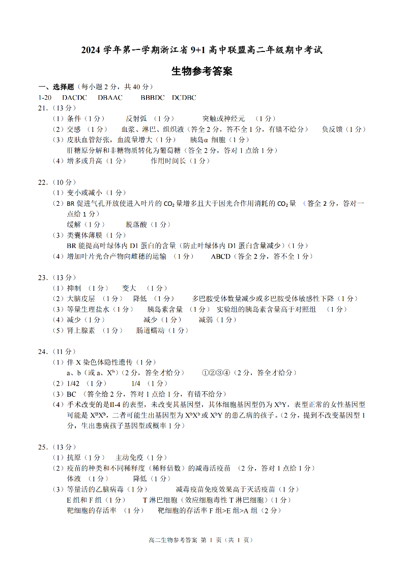 浙江省9+1联盟2024学年高二第一学期期中联考 生物答案