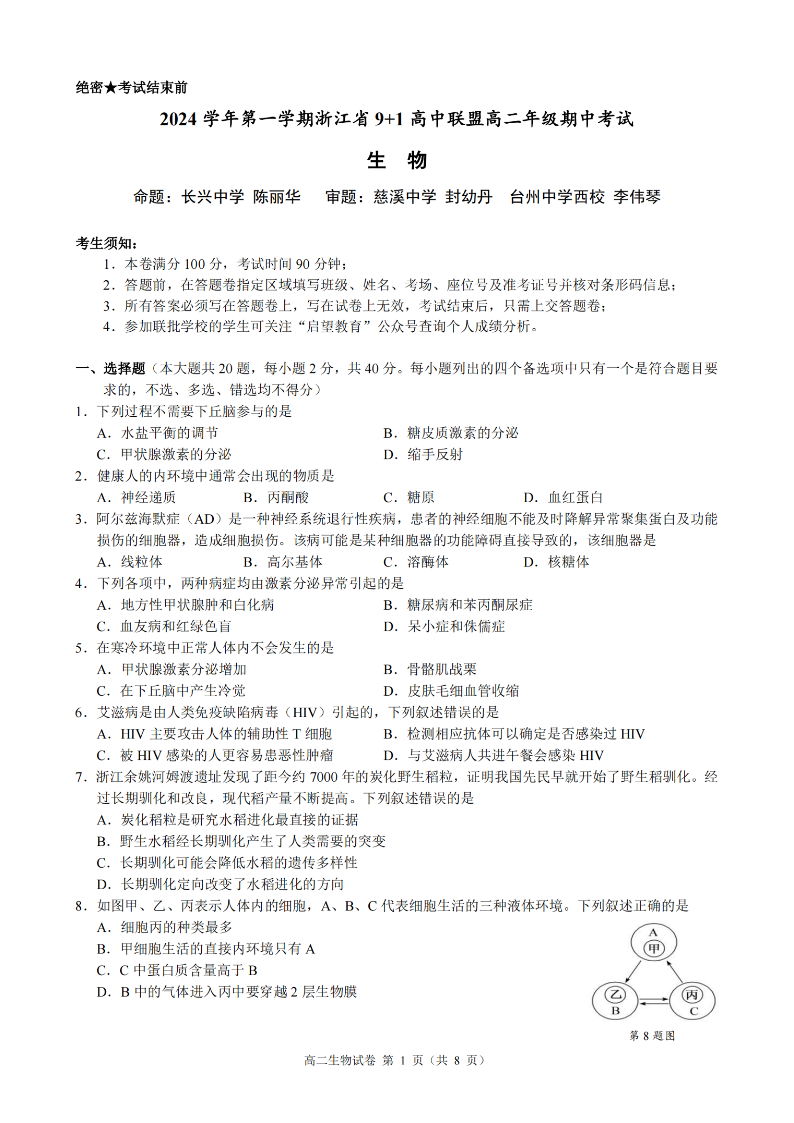 浙江省9+1联盟2024学年高二第一学期期中联考 生物