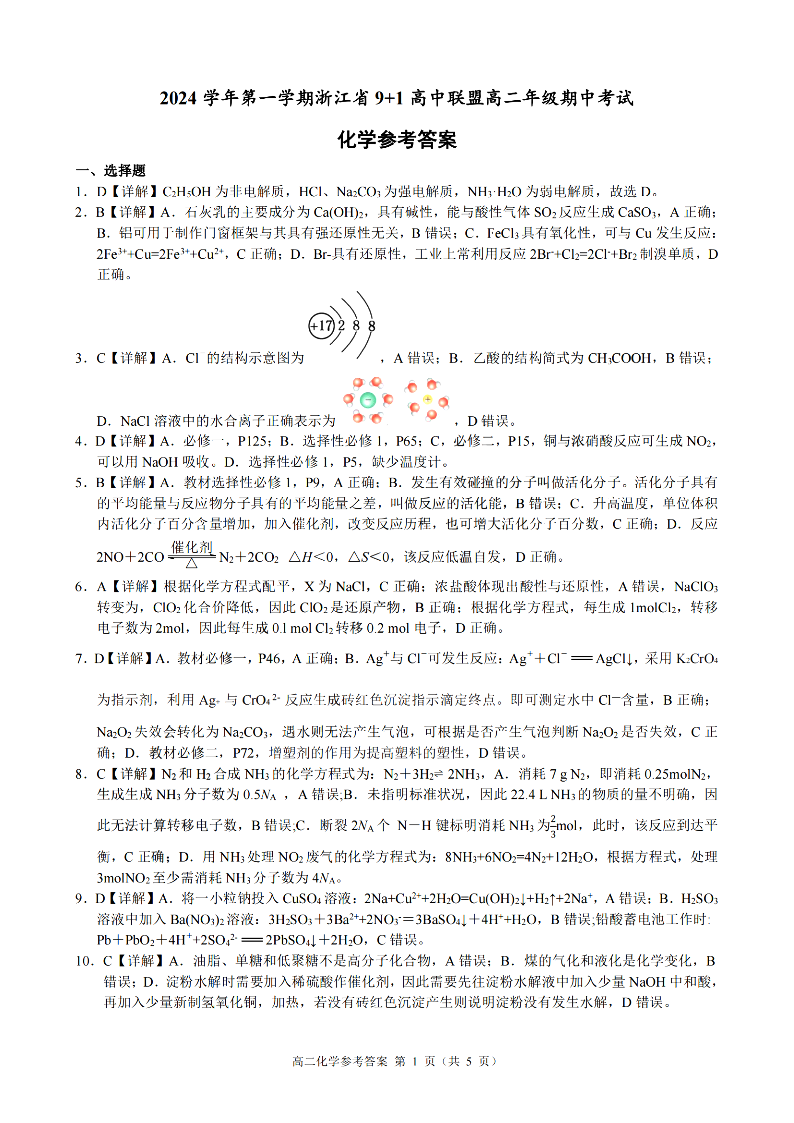 浙江省9+1联盟2024学年高二第一学期期中联考 化学答案