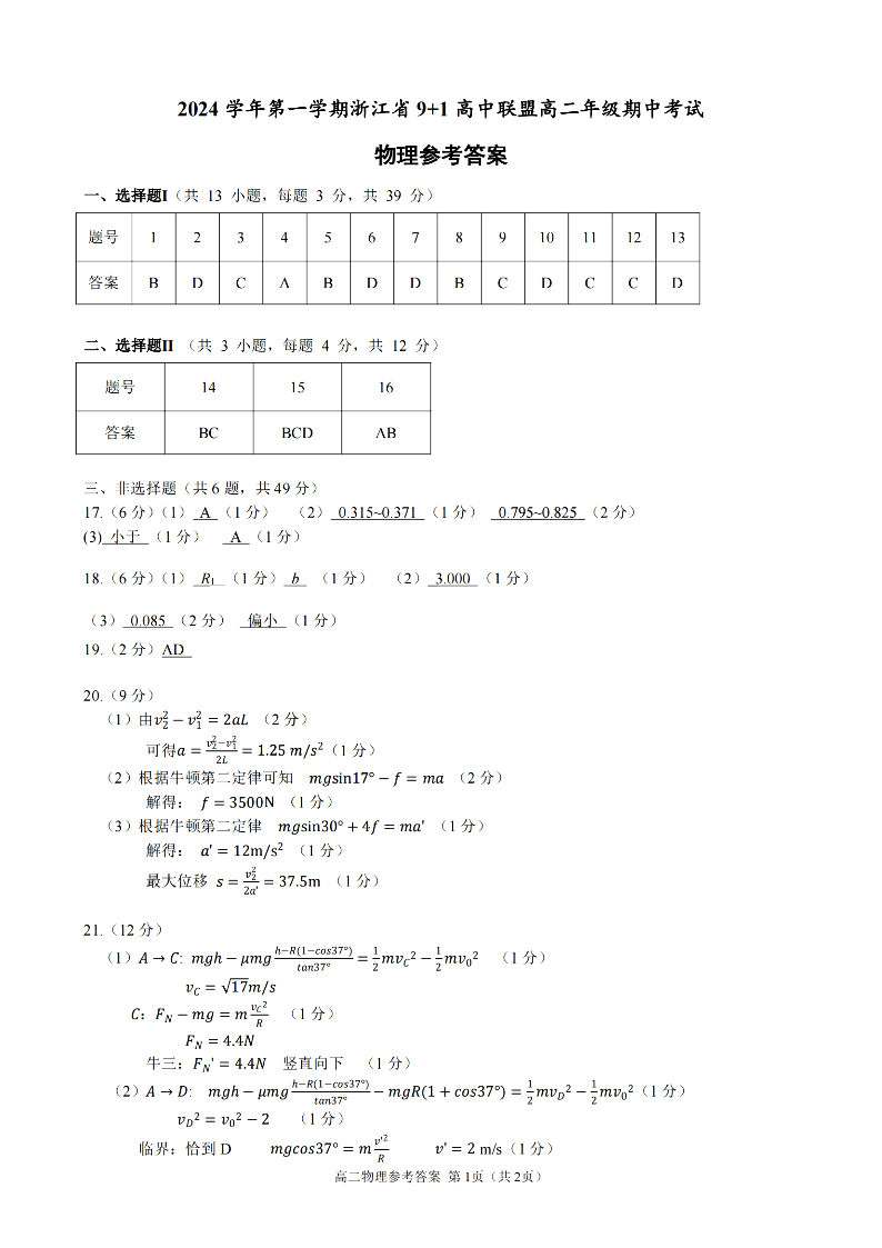 浙江省9+1联盟2024学年高二第一学期期中联考 物理答案