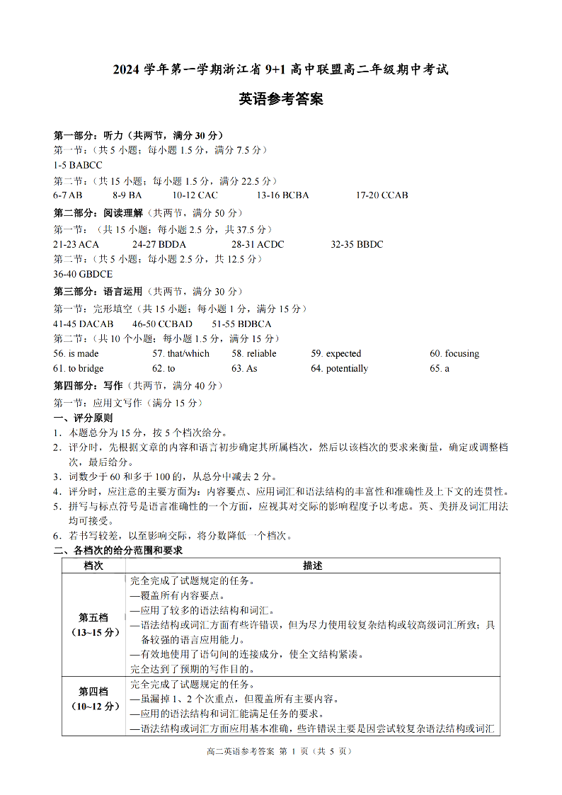 浙江省9+1联盟2024学年高二第一学期期中联考 英语答案