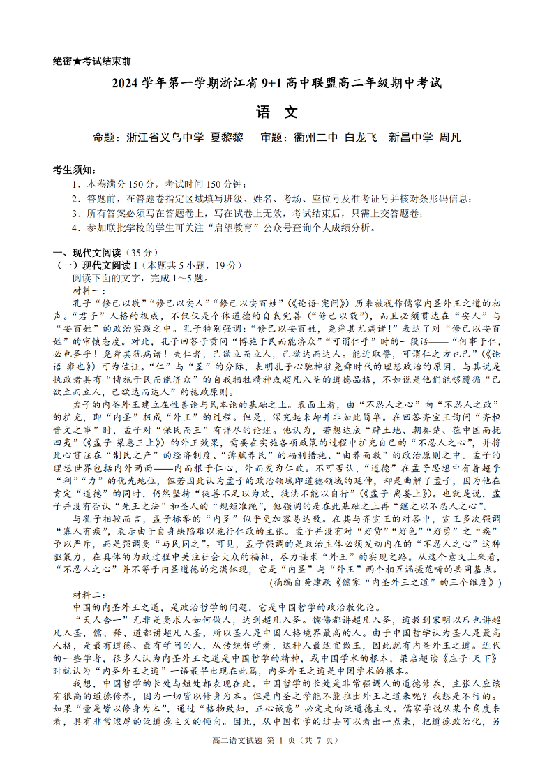 浙江省9+1联盟2024学年高二第一学期期中联考 语文