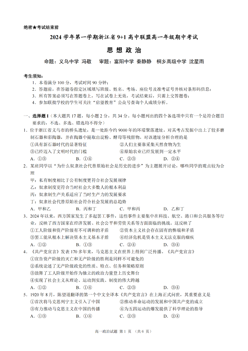 浙江省9+1联盟2024学年高一第一学期期中联考 政治