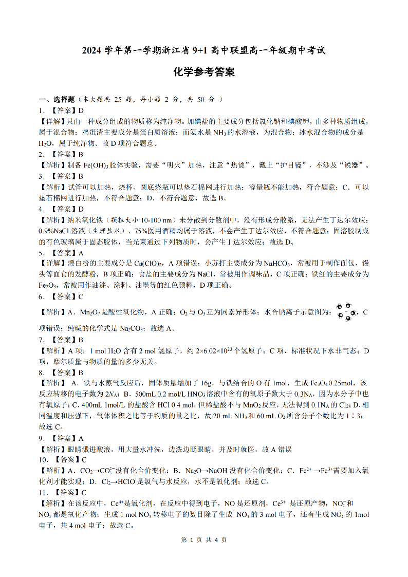 浙江省9+1联盟2024学年高一第一学期期中联考 化学答案