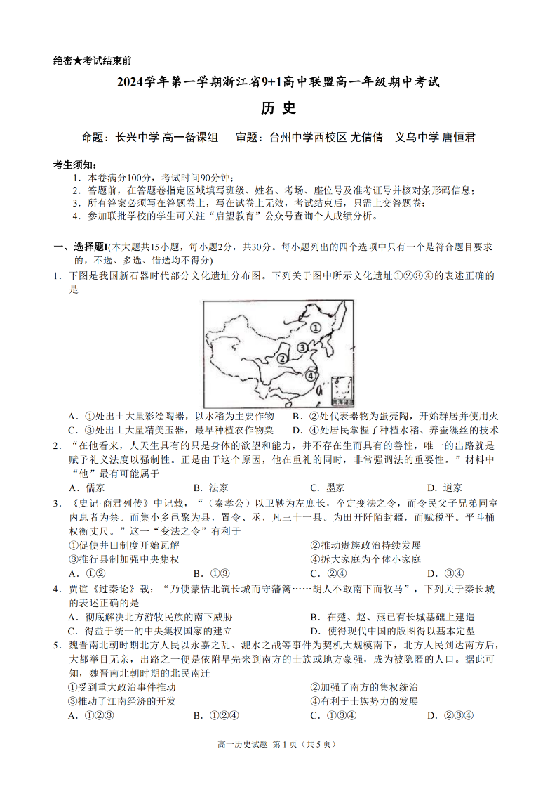 浙江省9+1联盟2024学年高一第一学期期中联考 历史