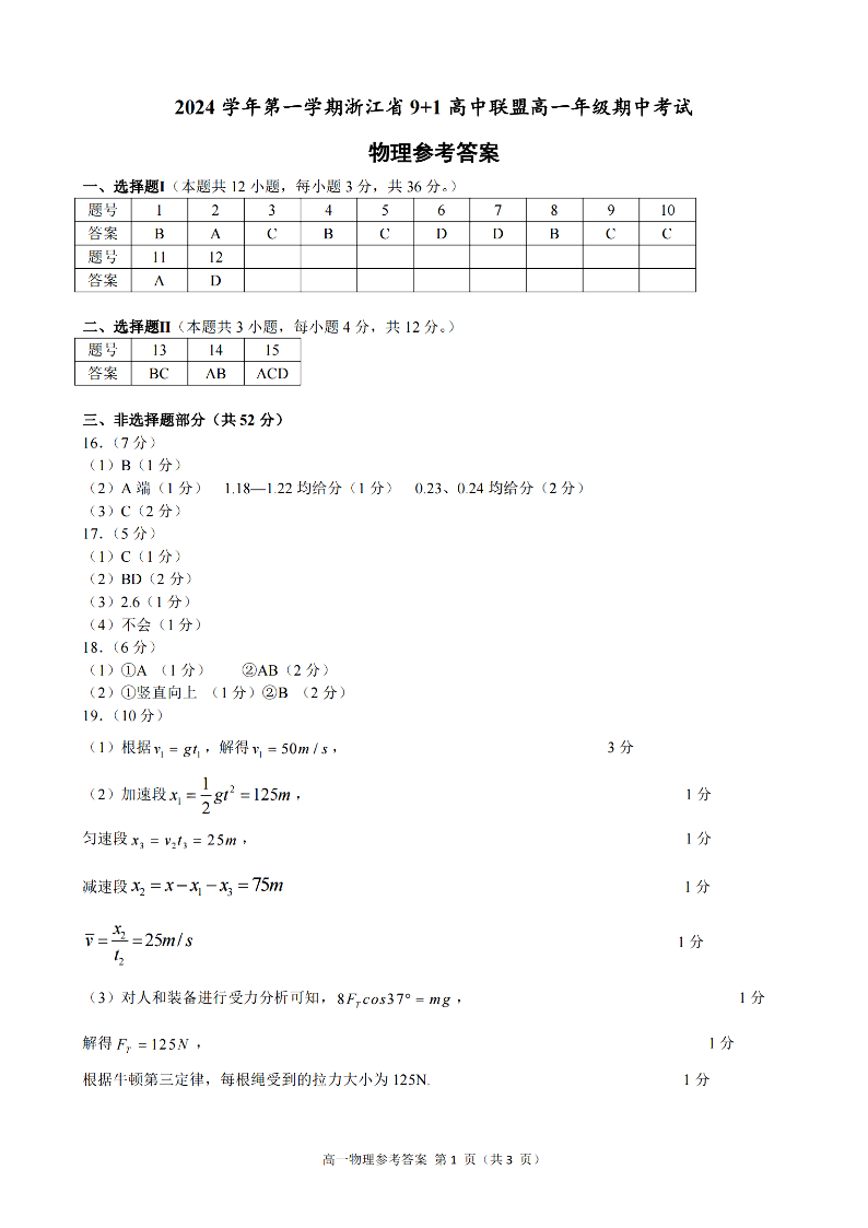 浙江省9+1联盟2024学年高一第一学期期中联考 物理答案