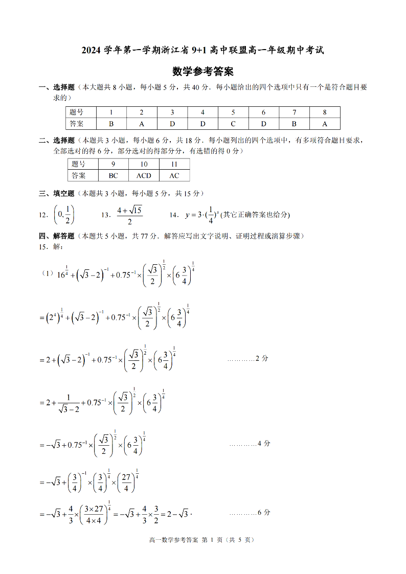 浙江省9+1联盟2024学年高一第一学期期中联考 数学答案