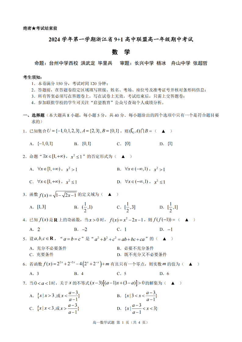 浙江省9+1联盟2024学年高一第一学期期中联考 数学