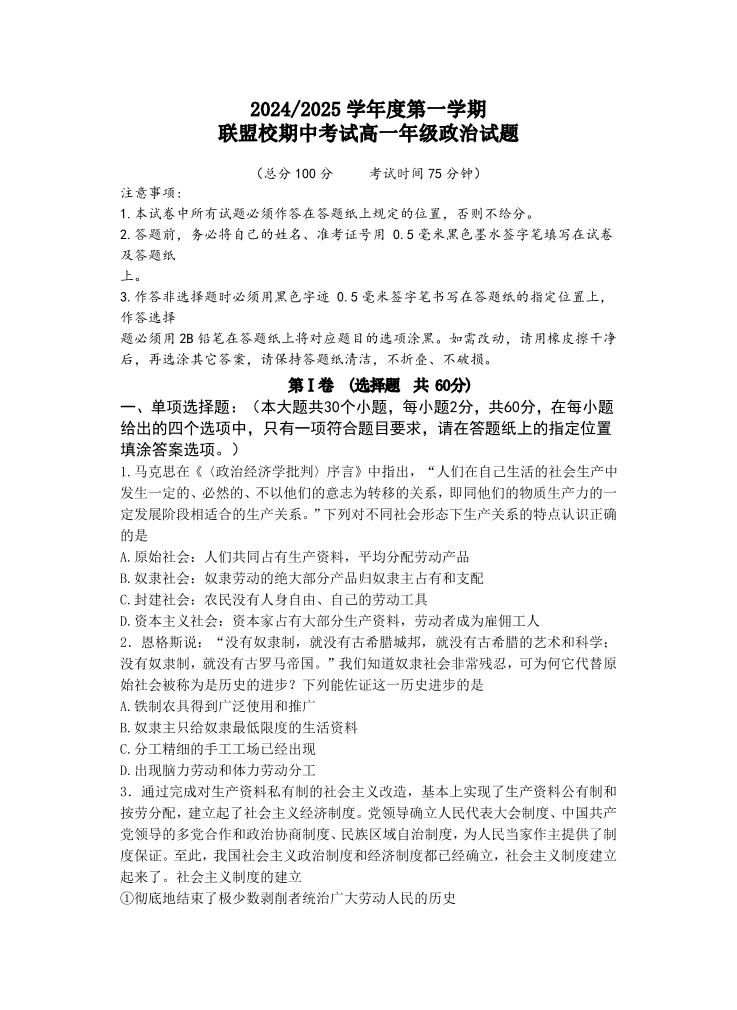 江苏省盐城市五校联考2024-2025学年第一学期高一年级期中考试 政治