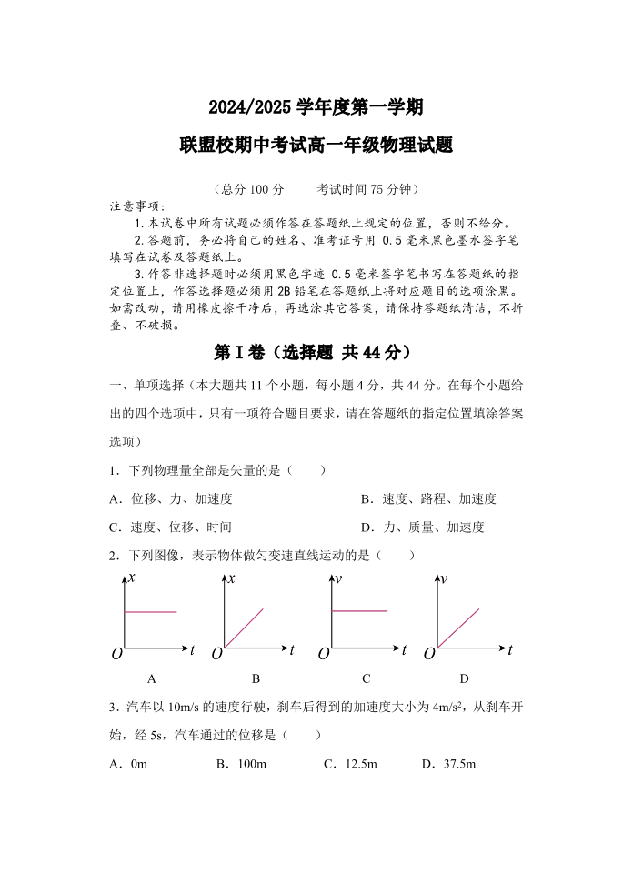 江苏省盐城市五校联考2024-2025学年第一学期高一年级期中考试 物理