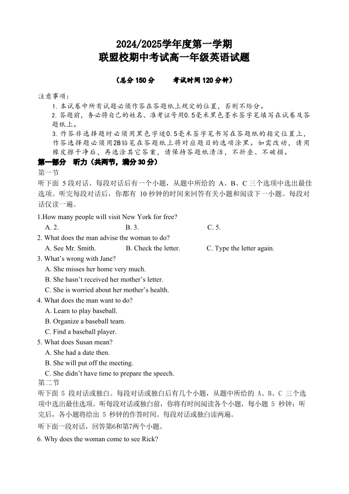 江苏省盐城市五校联考2024-2025学年第一学期高一年级期中考试 英语
