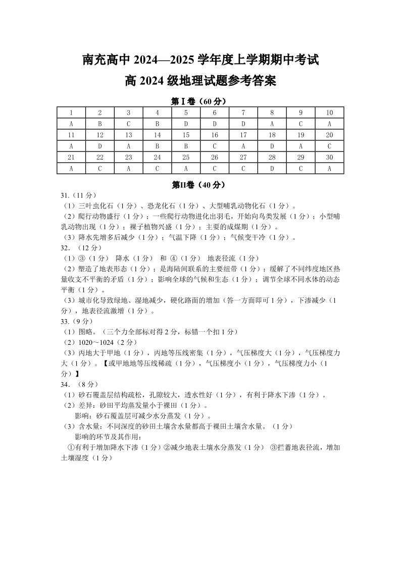 四川省南充高级中学2024-2025高一上学期期中考试 地理答案