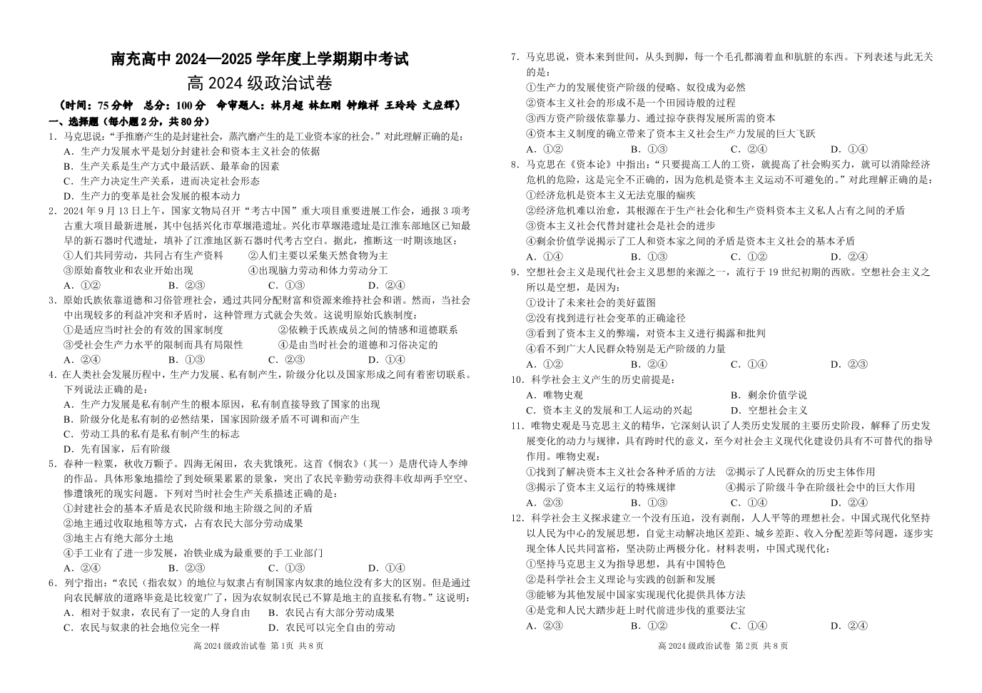 四川省南充高级中学2024-2025高一上学期期中考试 政治