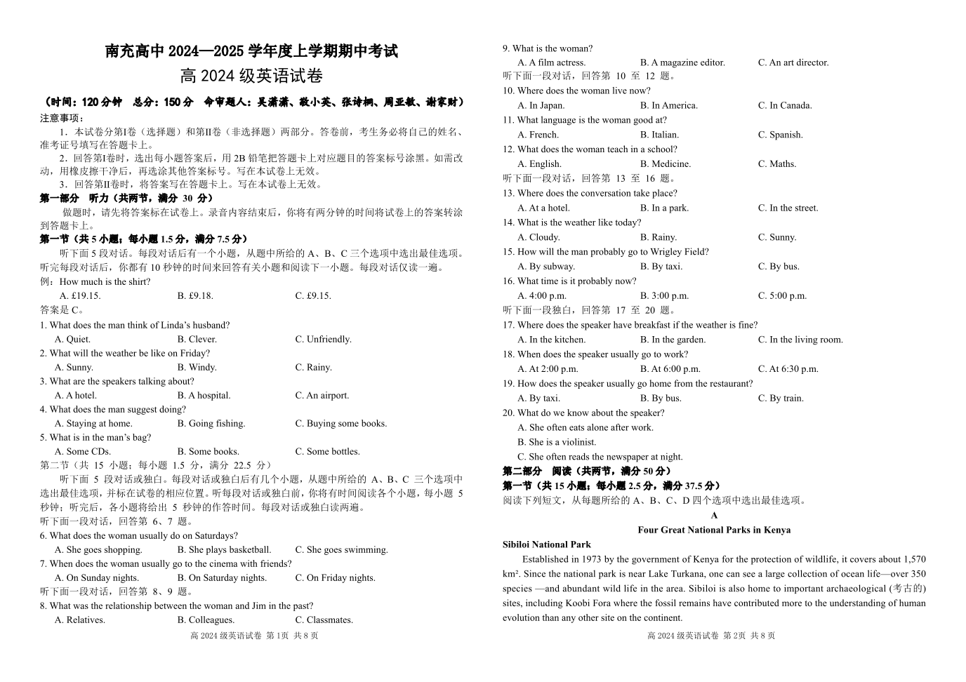 四川省南充高级中学2024-2025高一上学期期中考试 英语